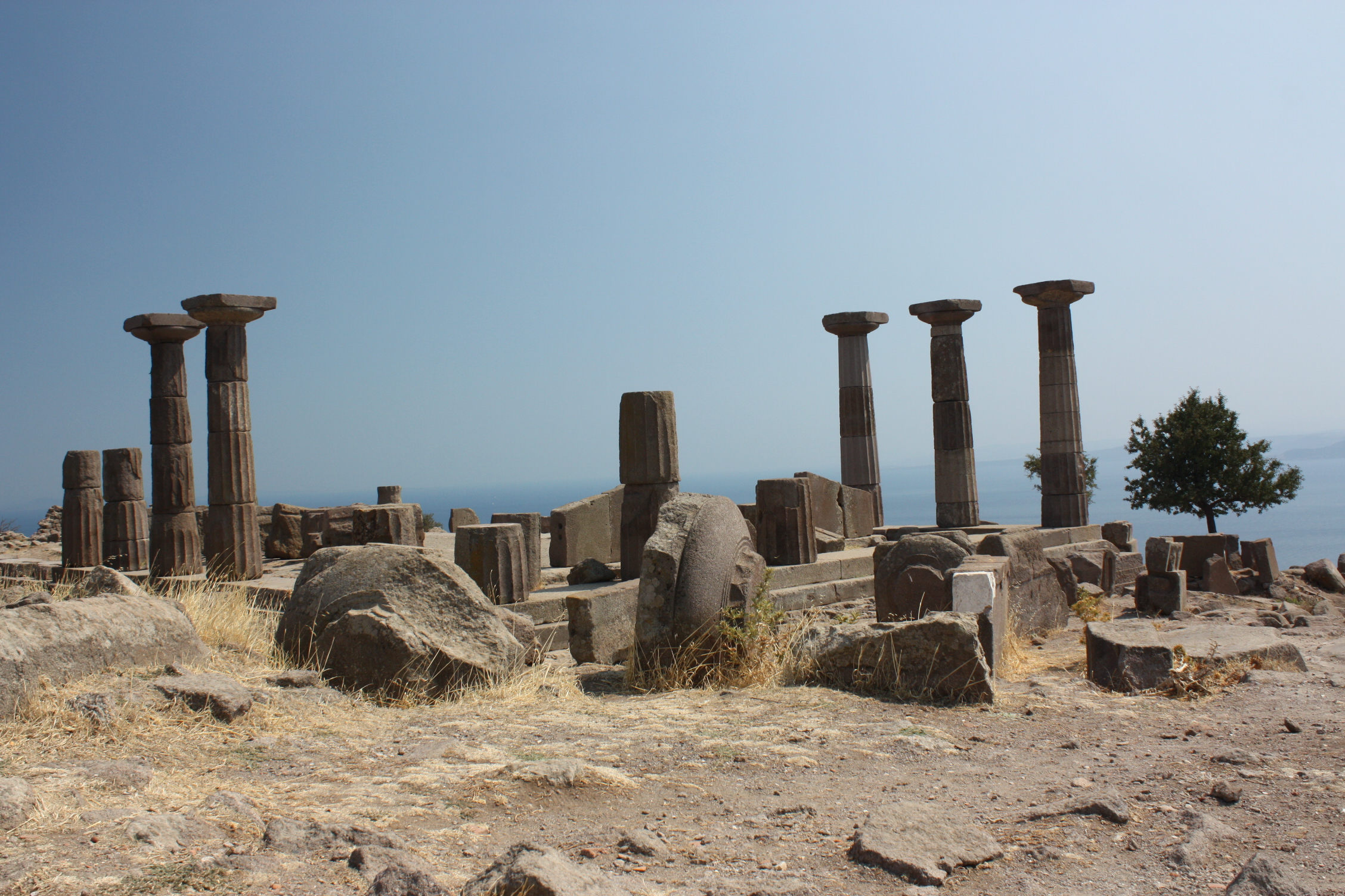 It is possible to see much of the surrounding area from the ancient Temple of Athena, built on top of a trachyte crag. From this temple, it is possible on a clear day to see nearby Lesbos in the south, Pergamum in the southeast, and Mount Ida of Phrygia in the east. To the north, the Tuzla River flows. To the northwest, there is the gate to the city of two massive Hellenic columns that still exist today.[4]