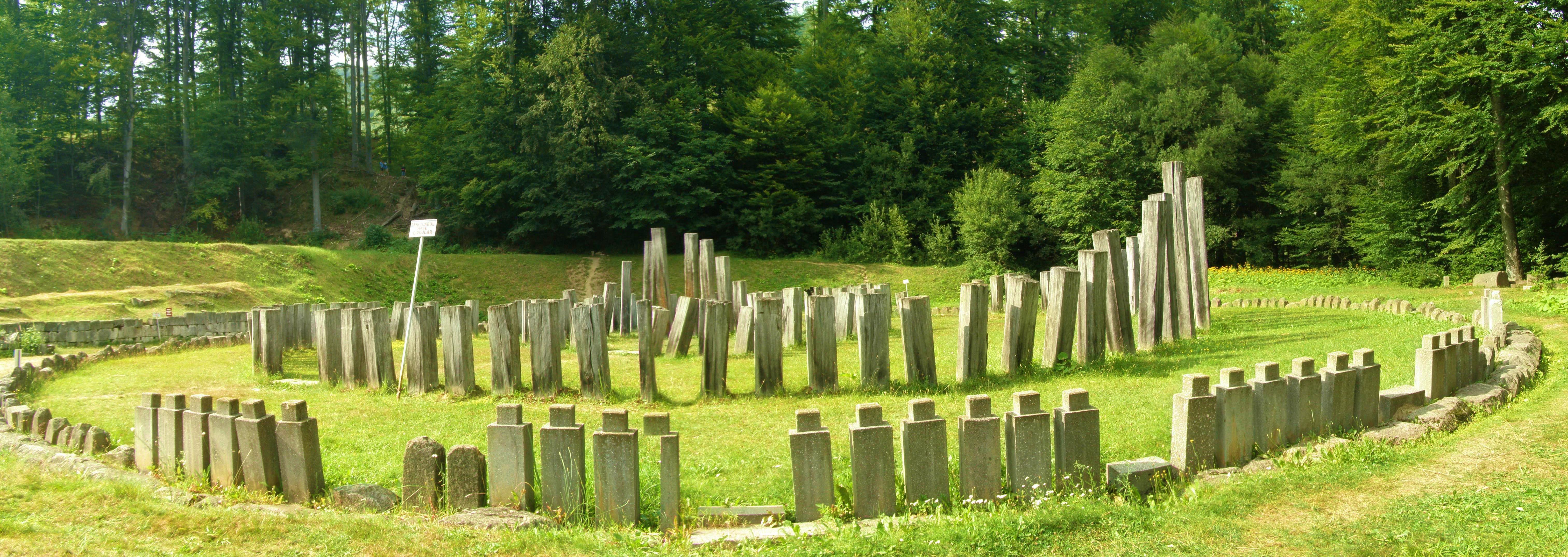 The sacred zone — among the most important and largest circular and rectangular Dacian sanctuaries – includes a number of rectangular temples, the bases of their supporting columns still visible in regular arrays. Perhaps the most enigmatic construction at the site is the large circular sanctuary. It consisted of a “D” – shaped setting of timber posts, surrounded by a timber circle, which was surrounded by a low stone kerb. The layout of the timber settings bears a broad resemblance to the stone monument at the Stonehenge in England.
